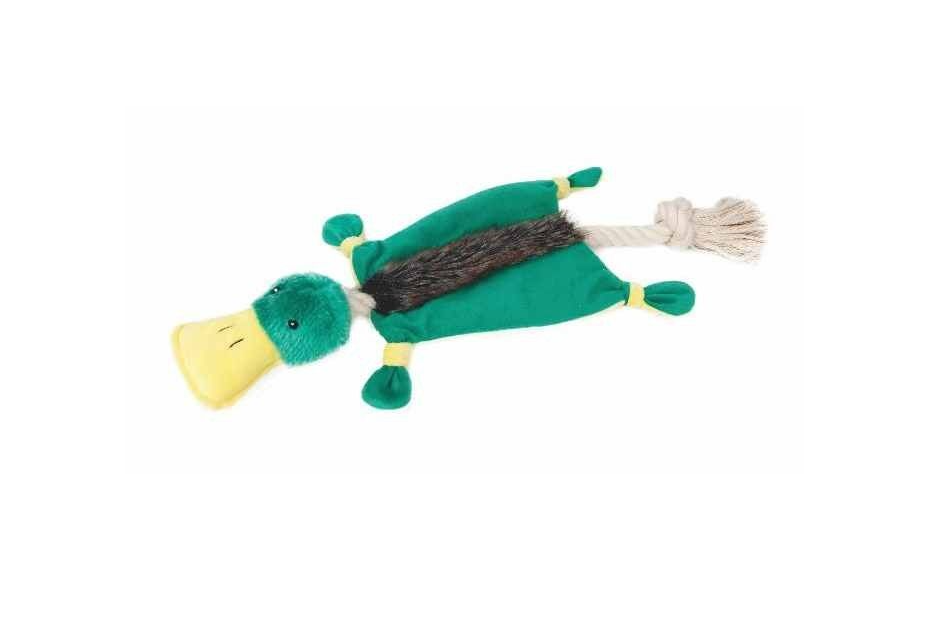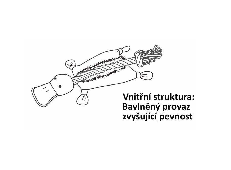 Plyšová pískací hračka ve tvaru kachny. Vnitřní struktura je zpevněná bavlněným provazem pro zvýšení odolnosti. V hlavě obsahuje pískátko a tělo šustí. Na končetinách jsou uzly k hraní.